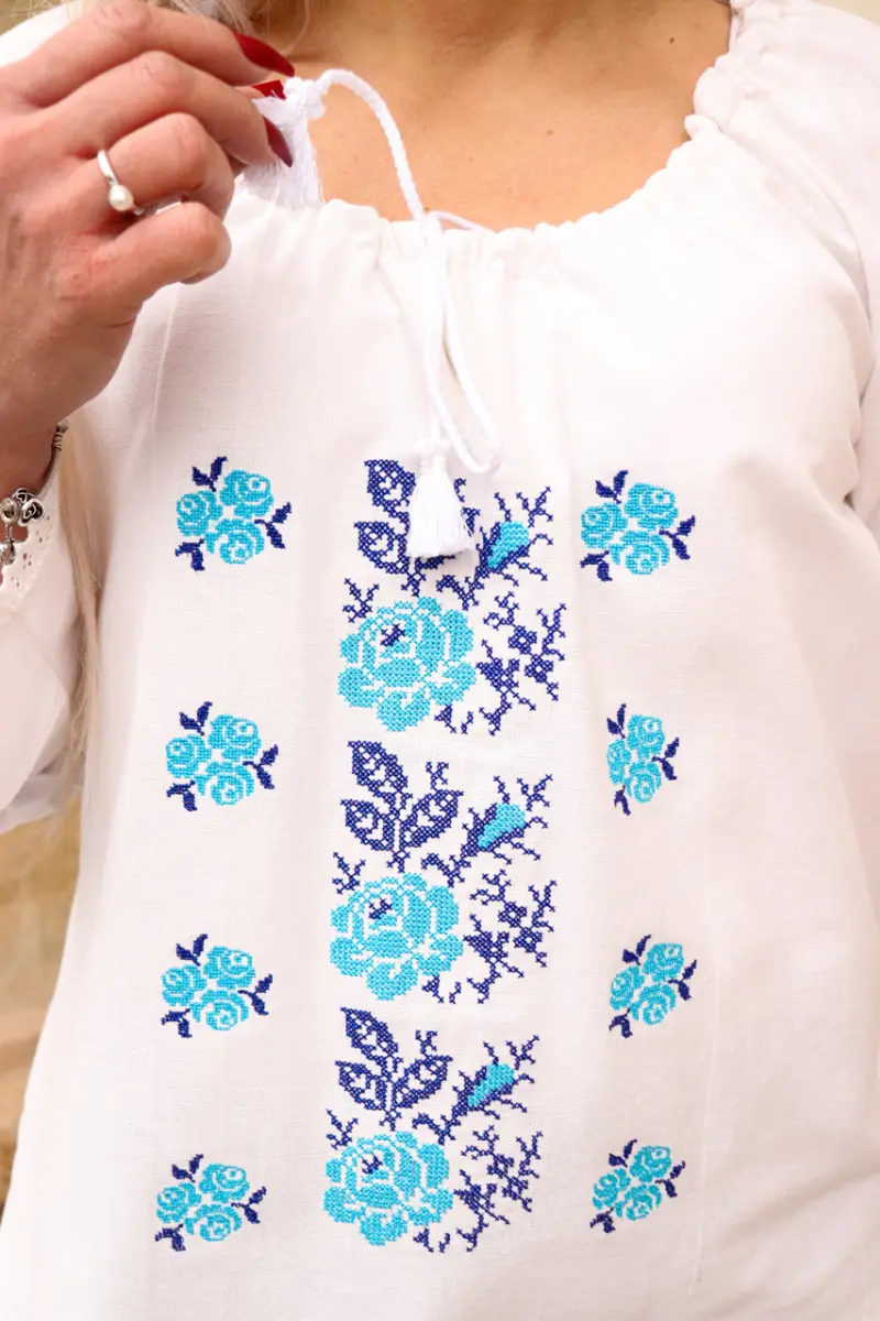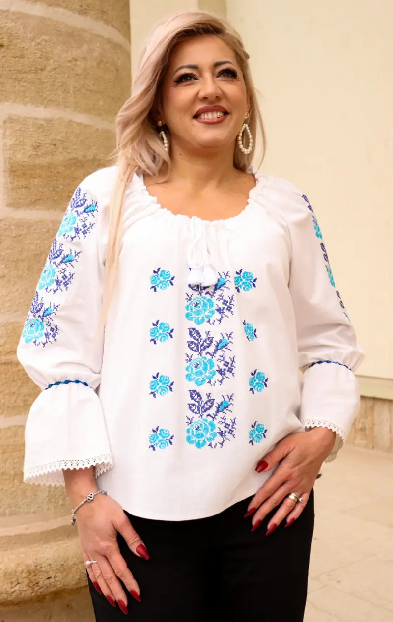 Ia tradițională Miruna reprezintă eleganța tradiției. Realizată din pânză de bumbac tradițională, cusută manual cu motive tradiționale românești, aduce farmecul autentic al portului popular în garderoba modernă. Această ie este alegerea perfectă pentru femeile care iubesc autenticitatea, eleganța și tradițiile românești. Poate fi purtată la evenimente speciale, sărbători populare sau în ținute de zi cu zi, aducând un strop de farmec românesc în orice moment.