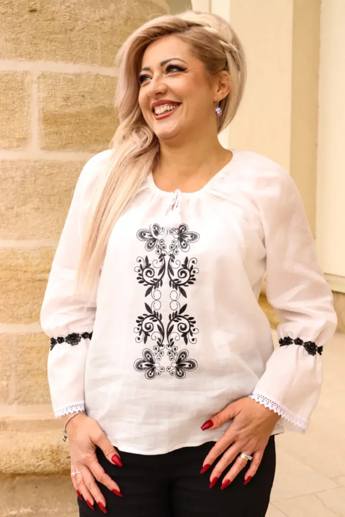 Ia tradițională Monica reprezintă eleganța tradiției. Realizată din pânză de bumbac naturală, de un alb imaculat, cusută manual cu motive tradiționale românești, aduce farmecul autentic al portului popular în garderoba modernă. Această ie este alegerea perfectă pentru femeile care iubesc autenticitatea, eleganța și tradițiile românești. Poate fi purtată la evenimente speciale, sărbători populare sau în ținute de zi cu zi, aducând un strop de farmec românesc în orice moment.