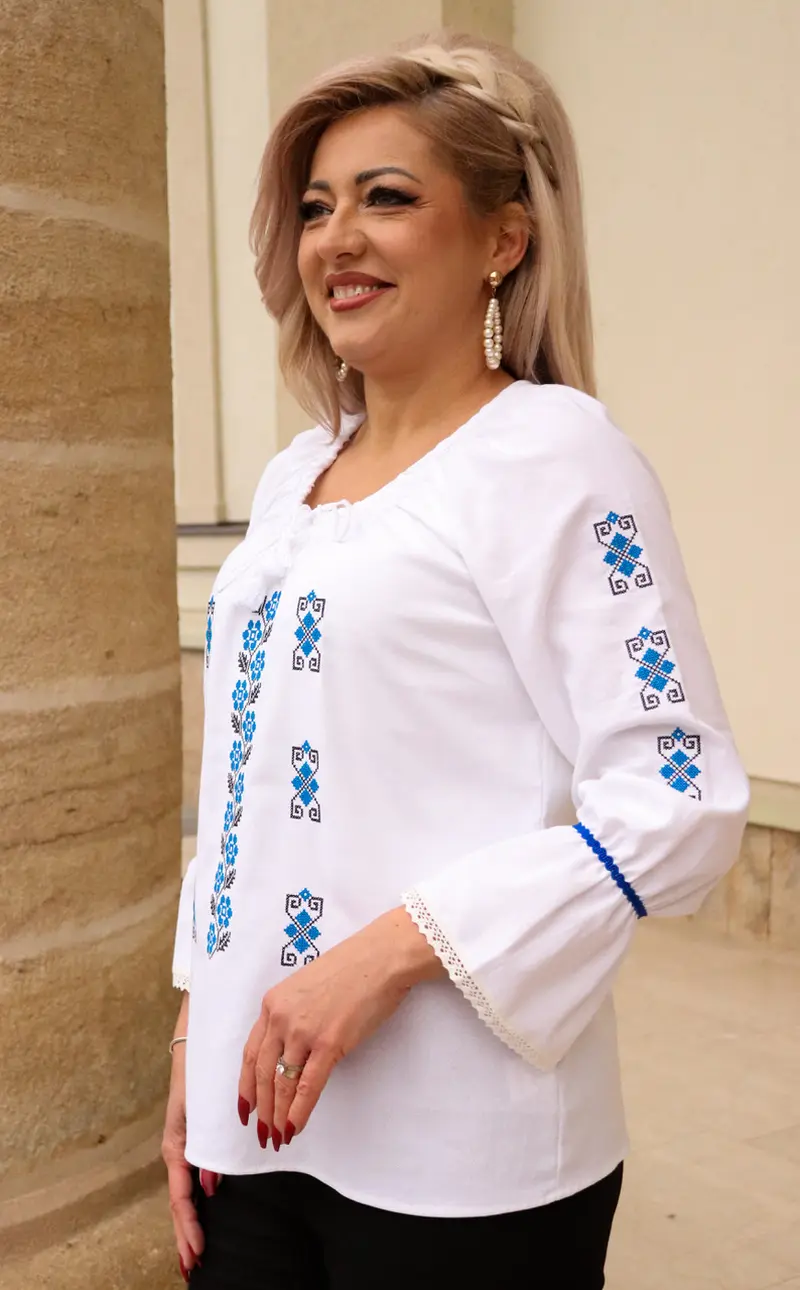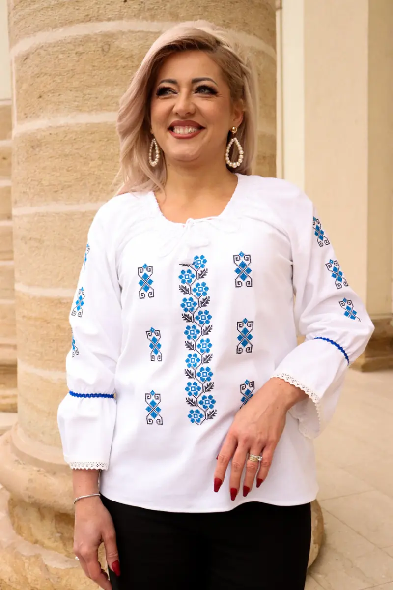 Ia tradițională Sofia reprezintă eleganța tradiției. Realizată din pânză de bumbac de un alb imaculat, cusută manual cu motive tradiționale românești, aduce farmecul autentic al portului popular în garderoba modernă. Această ie este alegerea perfectă pentru femeile care iubesc autenticitatea, eleganța și tradițiile românești. Poate fi purtată la evenimente speciale, sărbători populare sau în ținute de zi cu zi, aducând un strop de farmec românesc în orice moment.