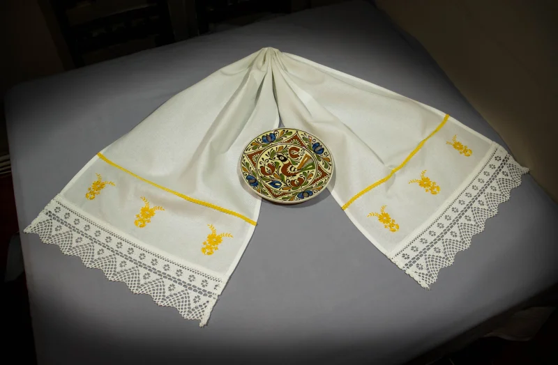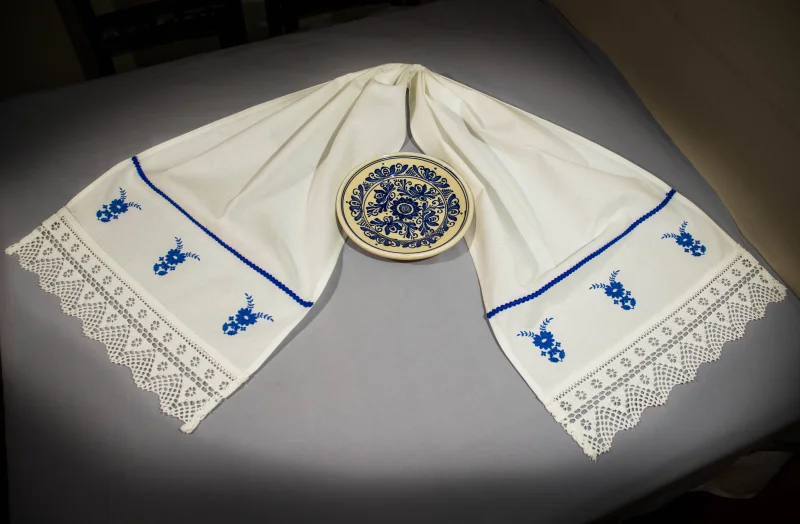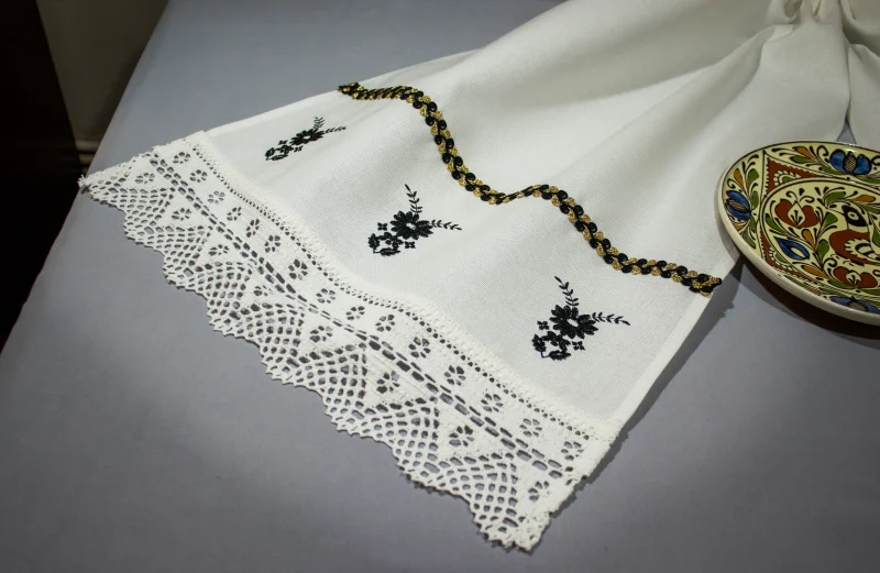 Exprimând eleganță și tradiție, acest stergar din pânză albă este o adevărată operă de artă. Confecționat din pânză de înaltă calitate, acesta rezistă testului timpului, menținându-și frumusețea și autenticitatea. Broderia este un spectacol de culoare, fiecare fir fiind așezat cu precizie pentru a crea un design vibrant și captivant. Dantela fină care încadrează stergarul adaugă un nivel suplimentar de rafinament, transformându-l într-un element de decor de neuitat. Fie că este expus în casa ta la o ocazie specială sau folosit în viața de zi cu zi, acest stergar tradițional românesc este o punte între trecut și prezent, aducând o notă de autenticitate și căldură în orice ambient.