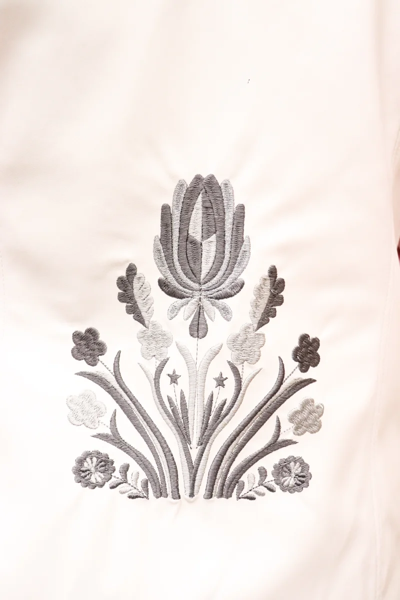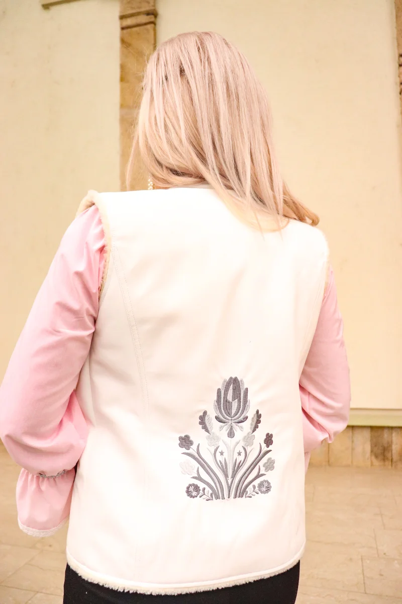 Reprezintă eleganța tradiției prin materialul din imitație de piele albă, interiorul călduros cu o blăniță discretă și decorată cu o broderie sublimă în nuanțe de gri, cu o atingere argintie. Fii sublimă prin eleganța tradiției!