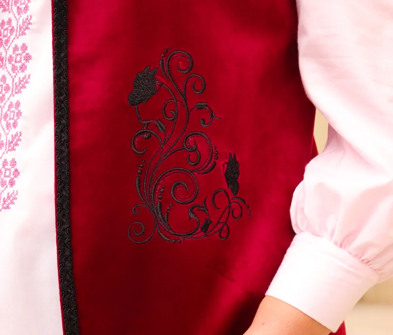 Din catifea bordo, cu un aspect rafinat, accentuată printr-o broderie sublimă și accesorizată cu un galon ornamental, evidențiază eleganța tradiției. Fii sublimă prin eleganța tradiției!