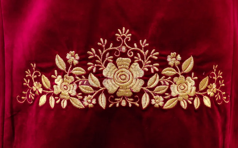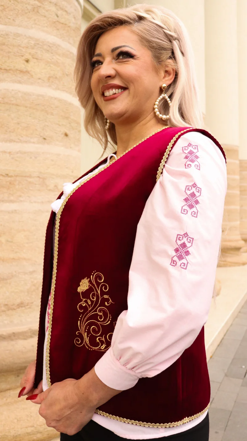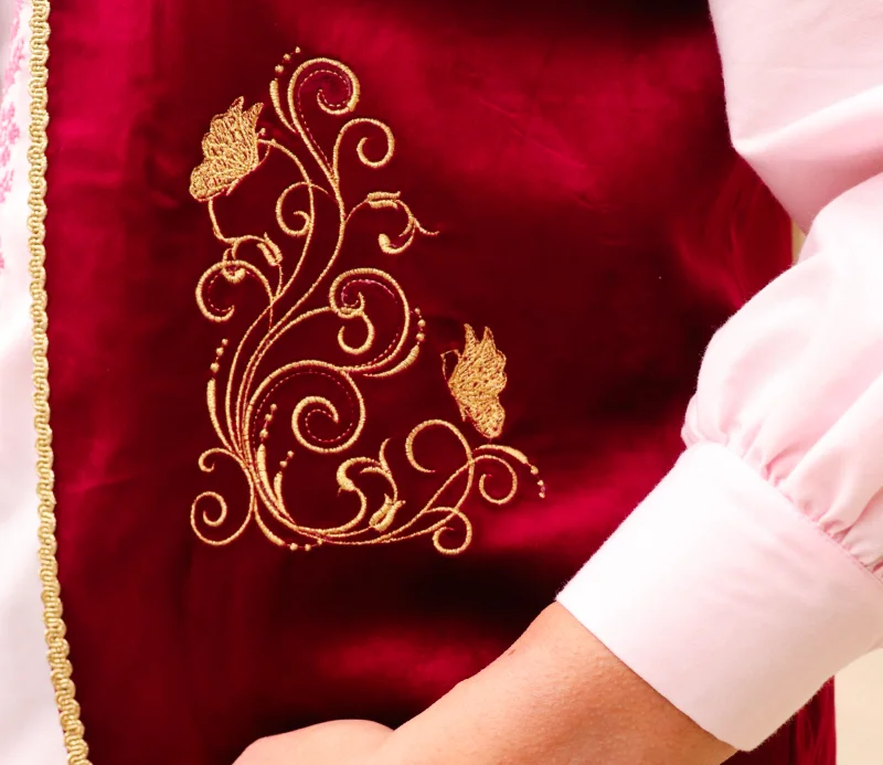 Din catifea bordo, cu un aspect rafinat, accentuată printr-o broderie sublimă și accesorizată cu un galon ornamental, evidențiază eleganța tradiției. Fii sublimă prin eleganța tradiției!